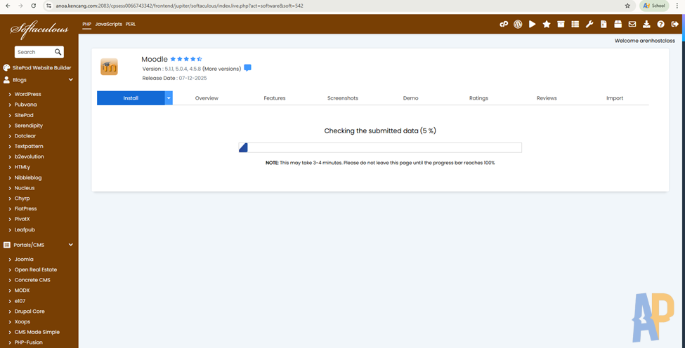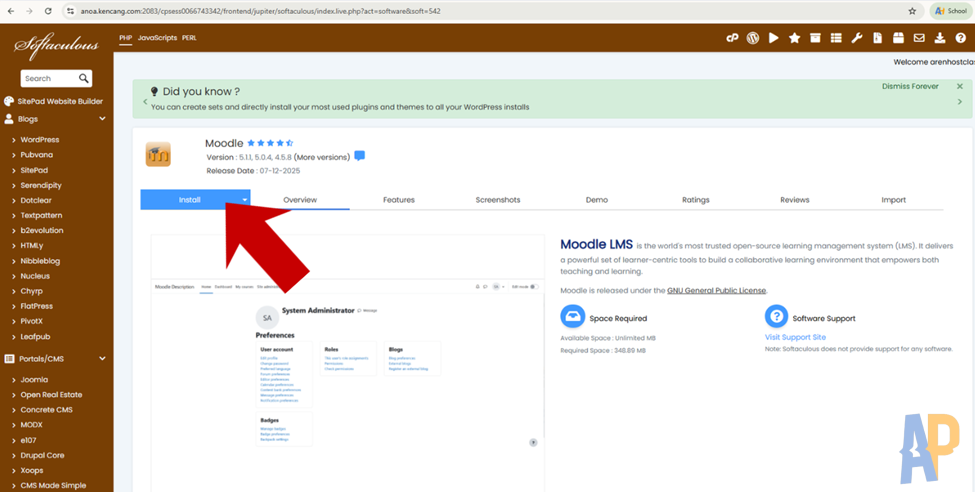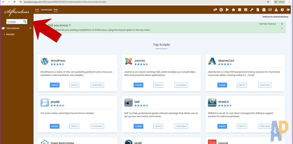2. Pada kolom pencarian Softaculous, ketik Moodle.