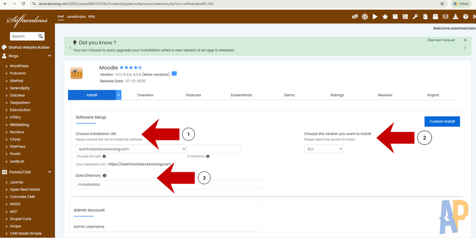 - Kolom 2: Pilih versi Moodle sesuai dengan kebutuhan Anda.