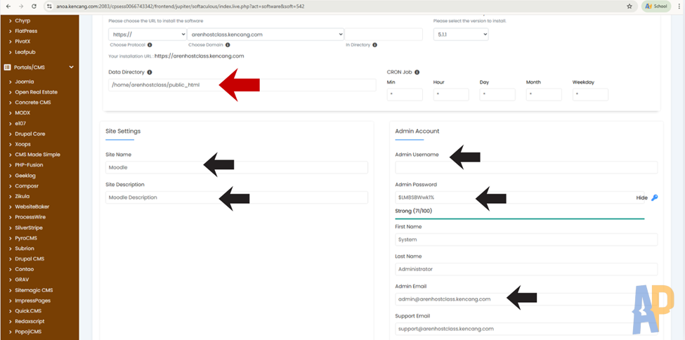 - Kolom 1: Pilih domain atau subdomain yang akan digunakan untuk instalasi Moodle.